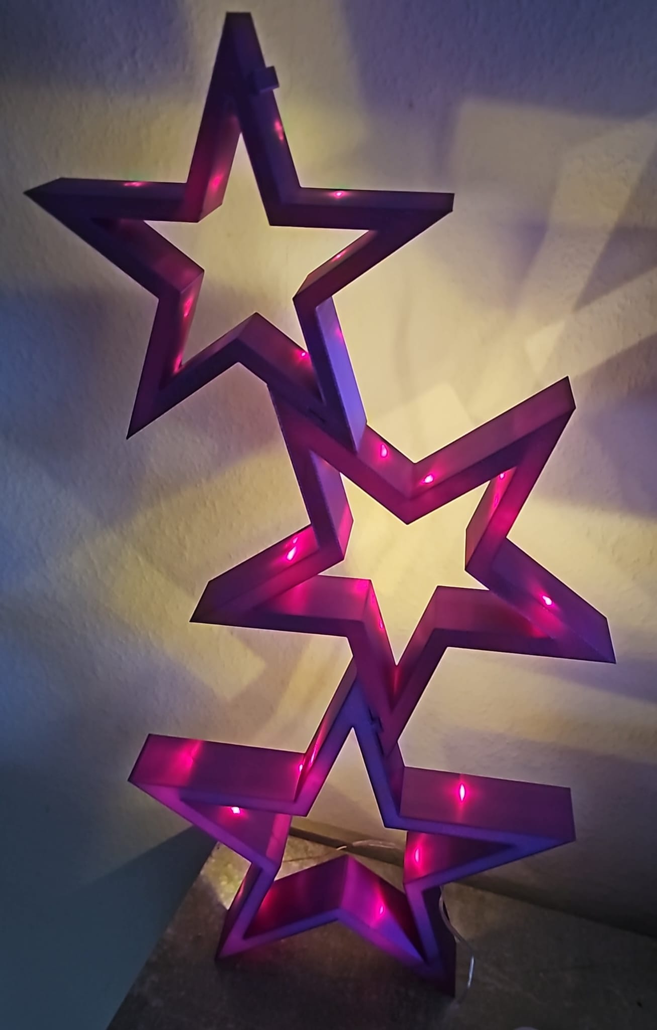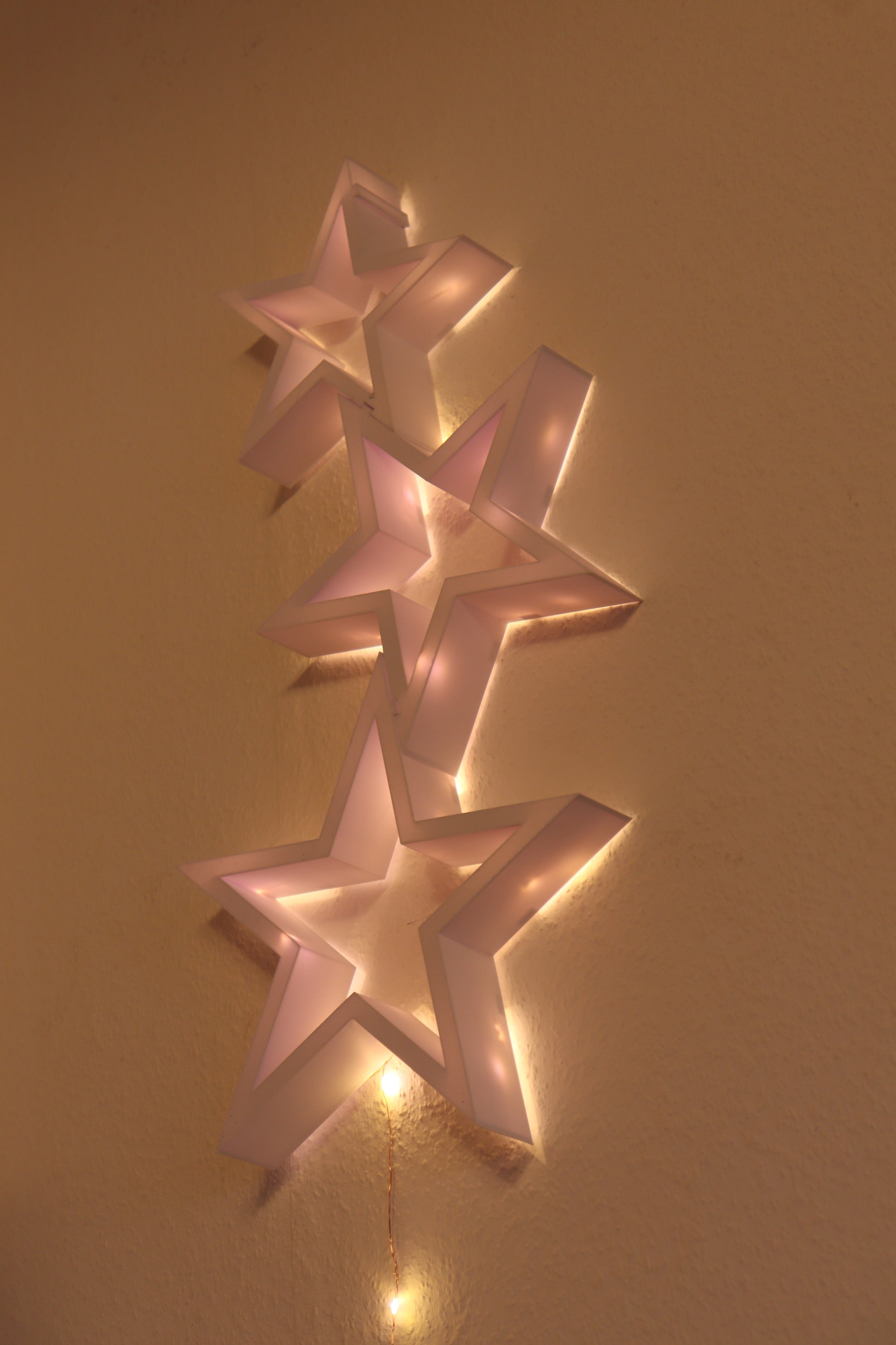 Diese wunderschöne Dekoration aus drei leuchtenden Sternen taucht Ihr Heim in ein magisches Licht. Die Sterne, gefertigt aus einem leichten Material, lassen sich mühelos an der Wand anbringen und individuell arrangieren.